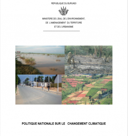 La Politique Nationale sur le changement climatique s’inscrit dans le cadre de la mise en œuvre de la Convention Cadre des Nations-Unies sur le Changement Climatique et du Protocole de Kyoto auxquels le Burundi est partie. Le but est de gérer efficacement le changement climatique de manière à ce que les effets néfastes qu’il a sur les différents secteurs et dans divers domaines soient réduits au minimum. Le présent document vise à renforcer la lutte contre le changement climatique dans le pays, et dans ce sens, sert de référence aux actions à entreprendre. Il donne également les grandes orientations de la lutte contre le changement climatique axées sur des stratégies de mise en œuvre.